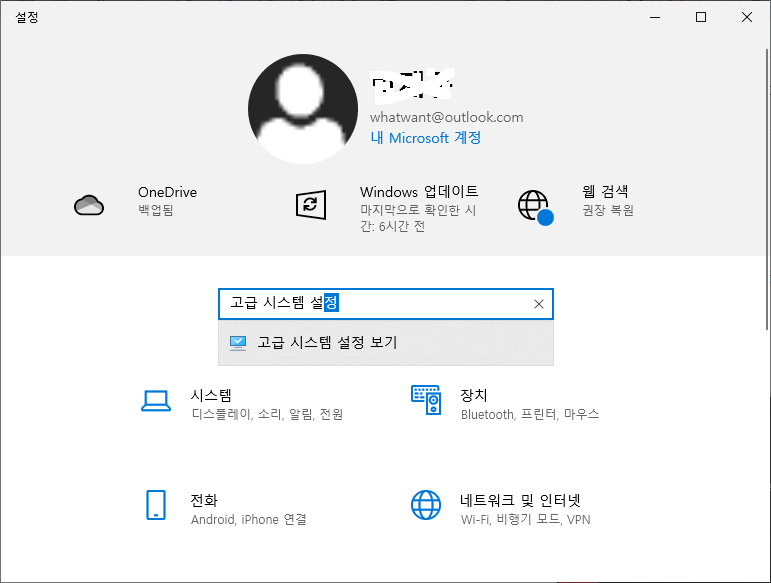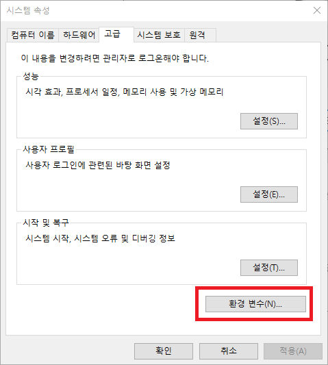 - 검색창에서 `고급 시스템 설정`을 타이핑 해서 나오는 결과를 클릭