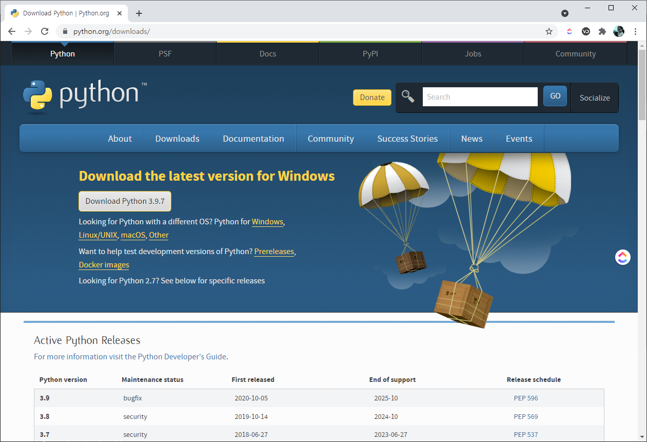 일단 Python 3.6 이상의 버전 설치가 필요하니 Go! Go! (여기에선 최신 버전은 3.9.7을 설치할 예정임!)