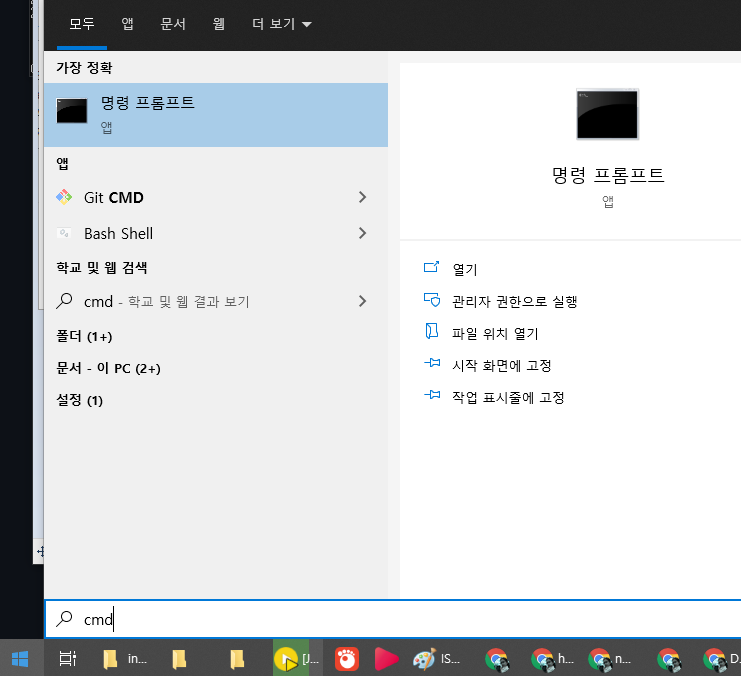 - 시작 메뉴에서 `cmd`라고 타이핑을 한 뒤, `명령 프롬프트` 클릭