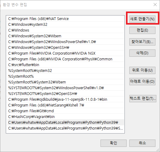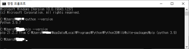 | C:\Users\<사용자>\AppData\Local\Programs\Python\Python39\ C:\Users\<사용자>\AppData\Local\Programs\Python\Python39\Scripts |