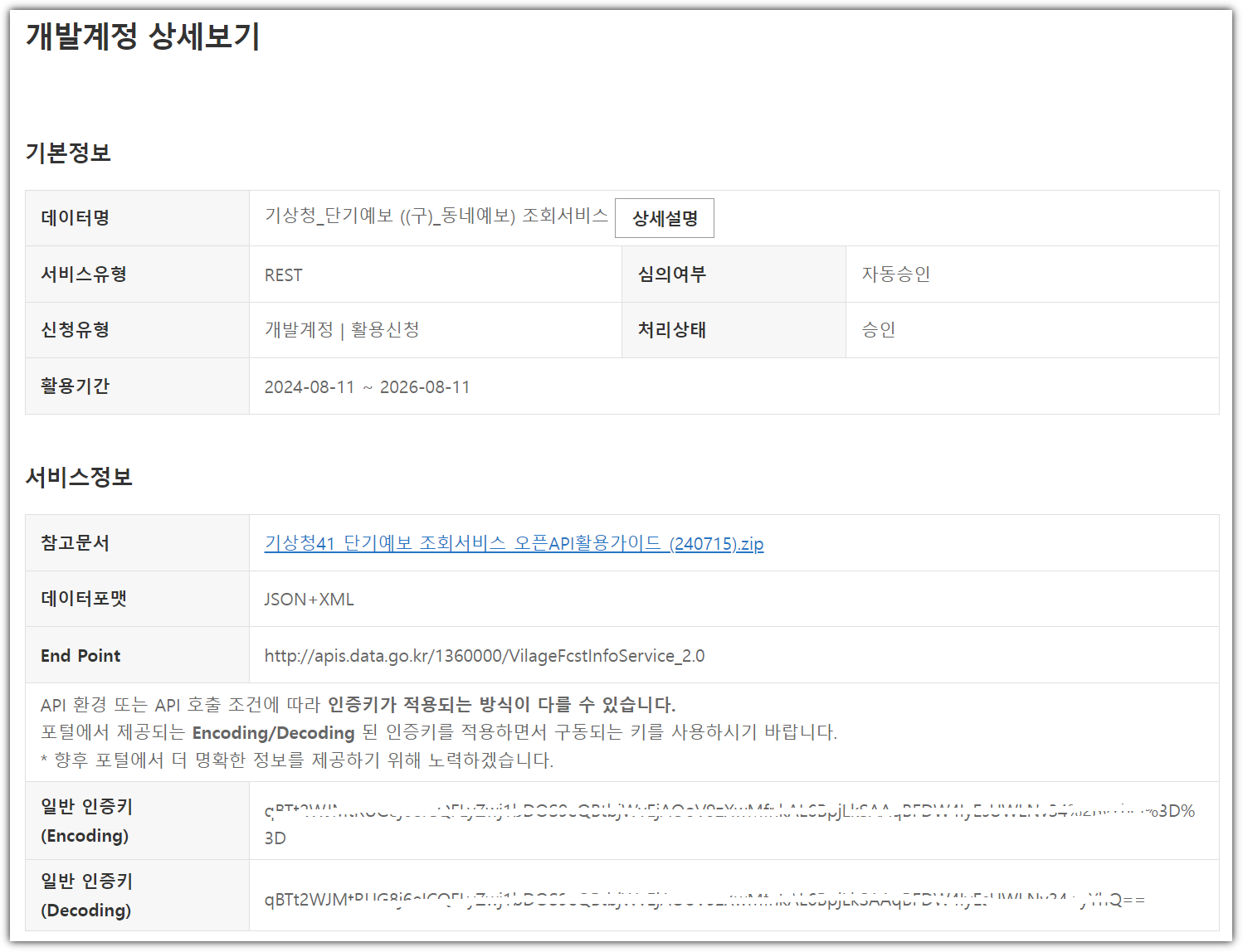 상세 내용을 보면 다음과 같이 인증키 정보를 확인할 수 있다.