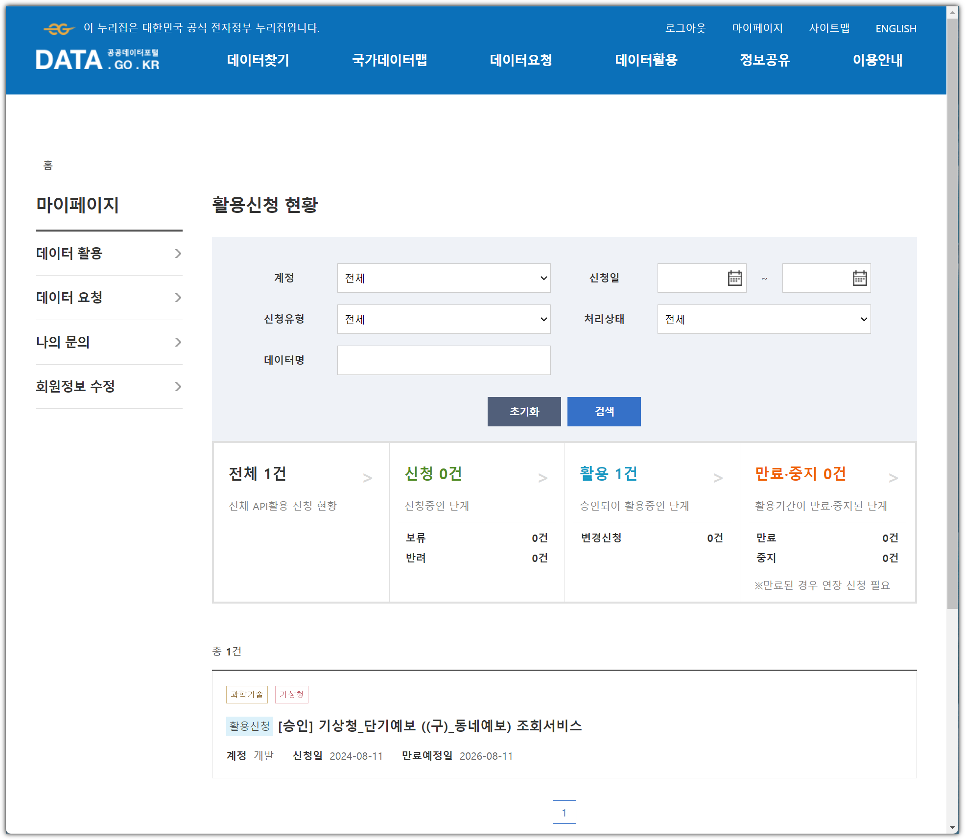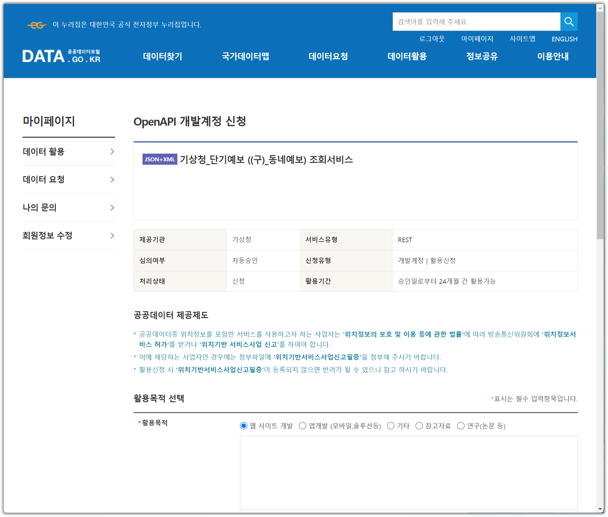 사용을 위해서는 오른쪽 상단에 위치한 "활용신청"을 클릭하면 된다.