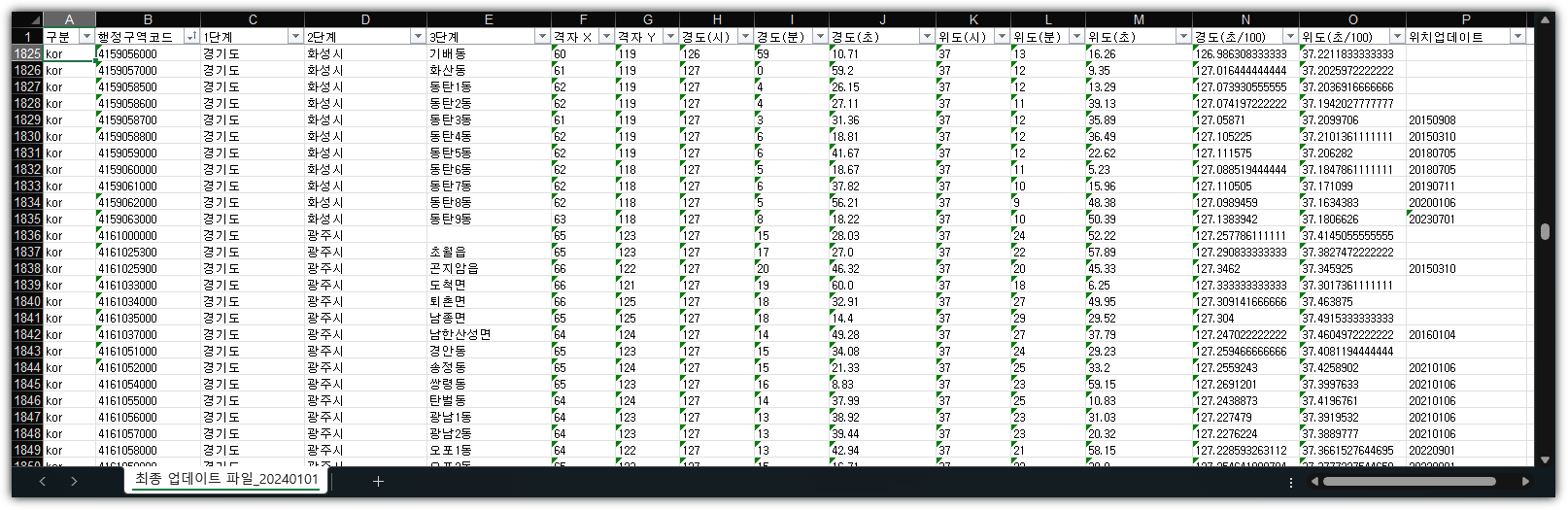- 압축을 풀면 문서 파일이 2개 나오는데, 위경도 정보가 있는 엑셀 파일을 확인하면 된다.