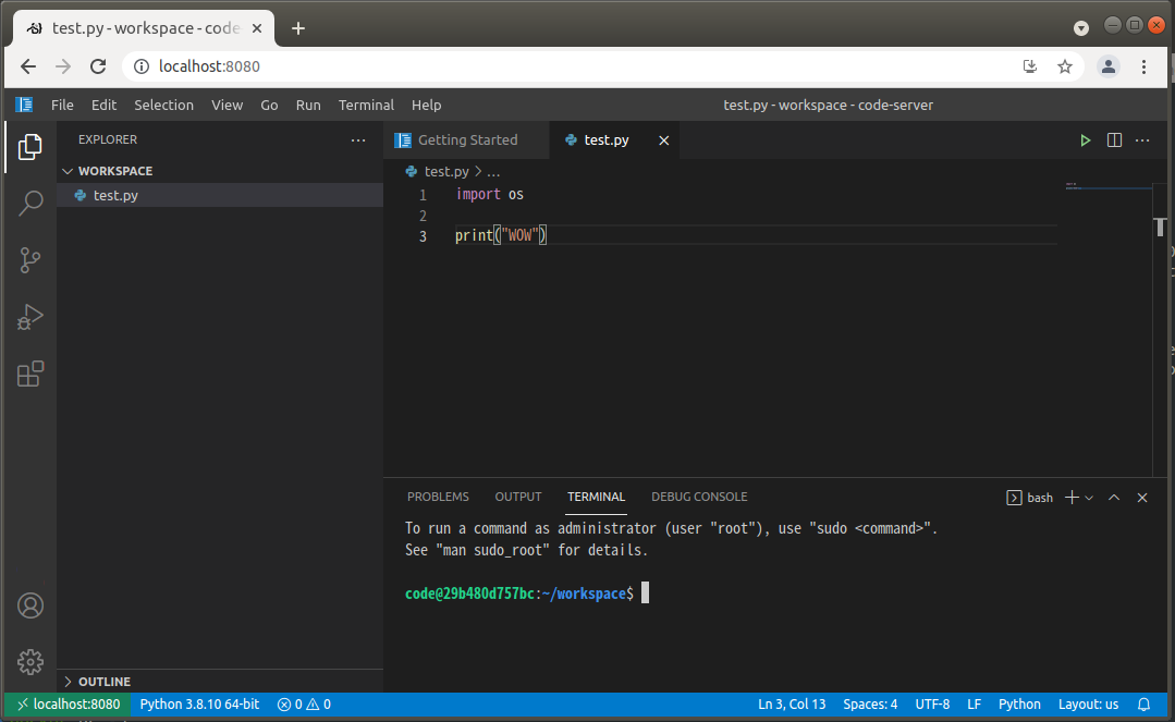 235751eb3ebb codercom/code-server:latest "dumb-init fixuid -q…" 4 minutes ago Up 4 minutes 127.0.0.1:8080->8080/tcp dreamy_haibt