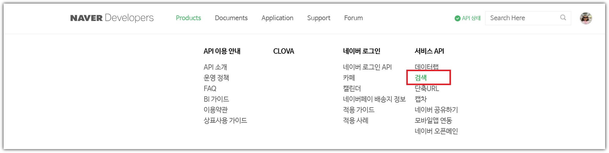 일단 여기에서는 "검색"을 위한 API 사용 신청하는 과정을 기준으로 설명해보겠다.