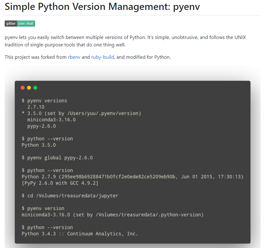일부 차이가 나는 부분에 대해서는 pyenv 사이트에 나오는 가이드를 참고하면 된다.